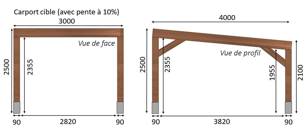 Ce modèle conviendra tout à fait à l’accueil d’un véhicule. Pour la toiture, nous vous conseillons plutôt les plaques nervurées, une couverture légère nécessitant peu de pente (10%). En réalisant ce choix, seules les plaques et leurs fixations seront à ajouter à ce pack (option couverture + 226€).
