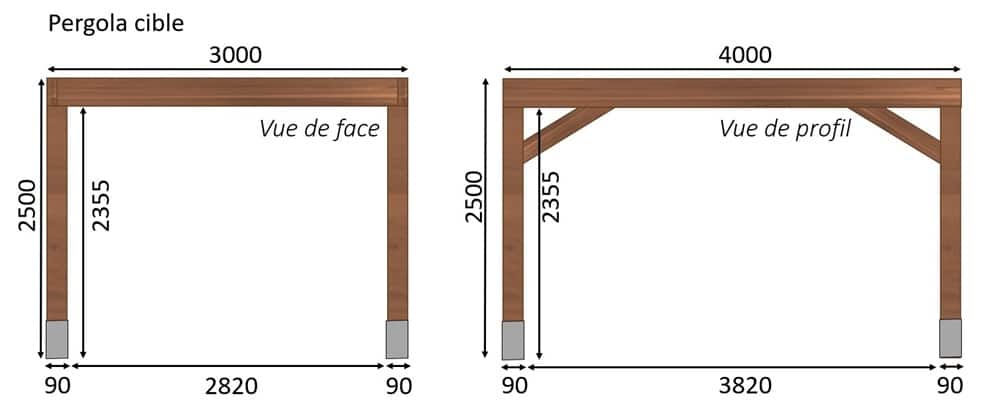 A noter : les fixations par entailles ainsi que les fixations par l’extérieur (45×120 sur 45×145) peuvent être évitées et remplacées par des fixations par sabots (plus faciles lorsqu’on est seul). Dans ce cas, il faudra prévoir de recouper les traverses de 4m en 3m82 et les traverses de 3m, non plus en 2m91 mais en 2m82.